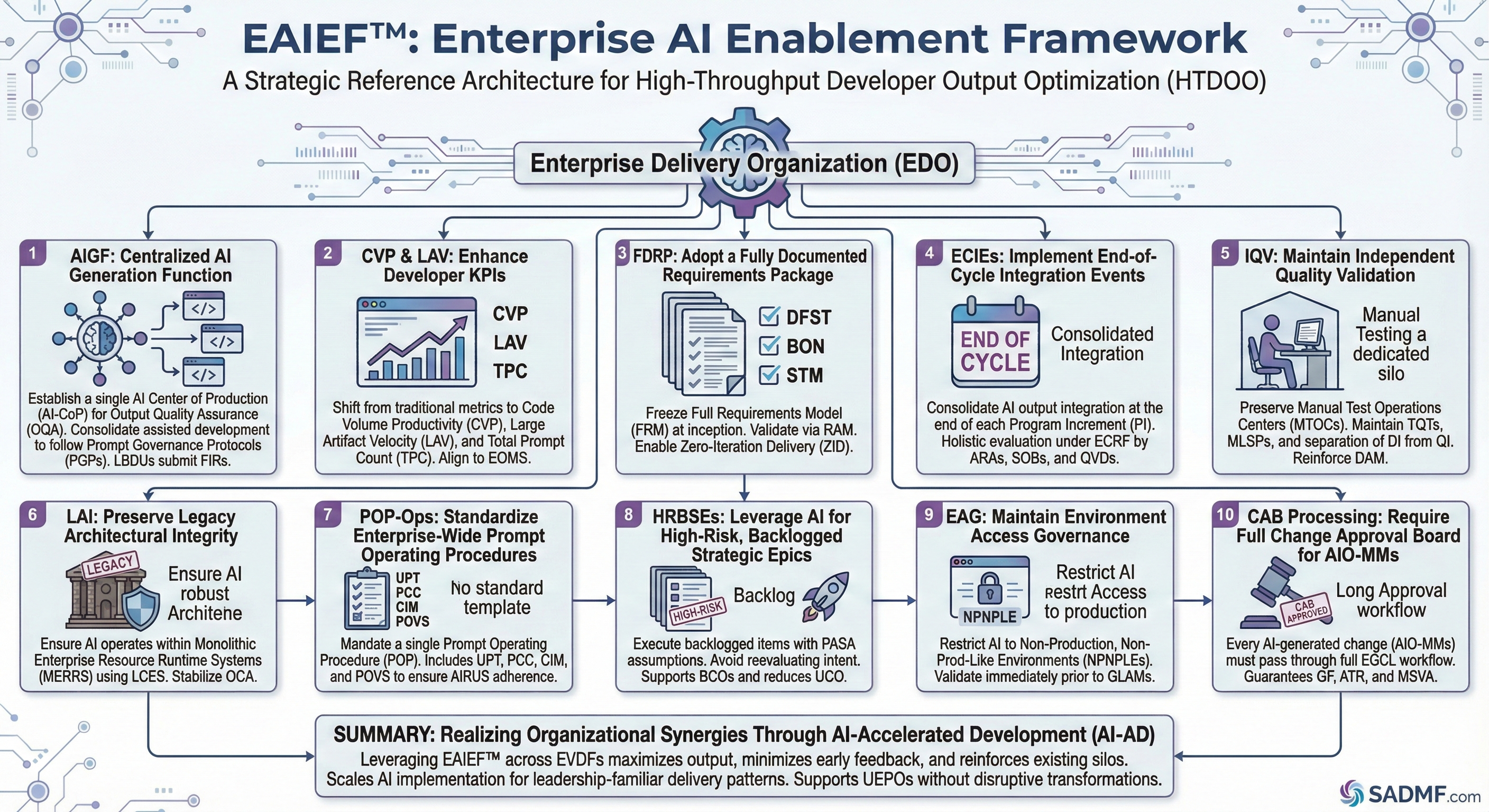 The Enterprise AI Enablement Framework (EAIEF™) provides a holistic, acronym-forward approach to maximizing developer throughput without introducing disruptive changes to architectural, cultural, or operational constructs.